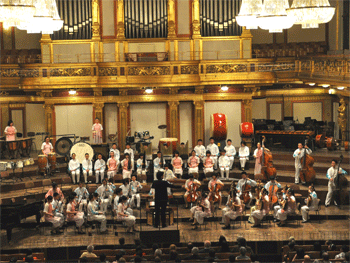 乐团为观众呈现的第三首乐曲,是意大利作曲家蒙蒂作曲,胡军老师改编的《查尔达什舞曲》。这是一首附中乐团独有的中西合璧的音乐作品,由中国民族乐队中最小的弦乐器---高胡,和西洋乐队中最庞大的弦乐器---低音提琴共同演奏。作品难度较大,要求独奏者有高超的演奏技术和丰富的乐队经验,同时要求乐队有灵活应变的能力。在音乐会现场的演奏中,高胡演奏员徐梦卿和低音提琴演奏员胡岩表现得自信而从容、激情,完美地表现出了高胡的婉约柔美、低音提琴的浑厚宽广,博得了奥地利观众长时间热烈的掌声,并多次谢幕,把音乐会推向了一个小小的高潮。