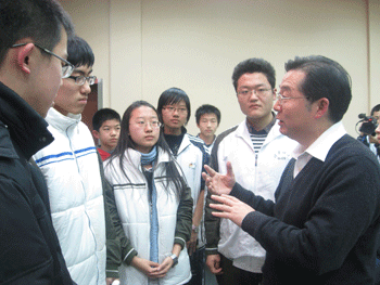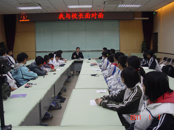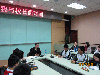 2011年1月7日、8日两天,澳门博彩在线“我与校长面对面”系列活动在教育培训楼会议室举行。这次活动是学生会外联部主要策划、组织的,交流活动分为“教学”“生活”两个场次。来自初一、初二、高一、高二的众多学生积极参加了此次与王殿军校长的面对面交流。德育处副主任辛颖、陈桂芬、团委书记刘贝贝老师出席了活动。
