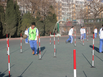 特别邀请体育组老师制订比赛规则:撞到杆一定要扶起来,若球运丢了,捡回后必须要回到丢球位置,有犯规行为扣除相应分数;明确班级的每一位同学都要上场,接力传球。比赛过程中大家表现非常出色,女生运球平稳,速度较快,初有技巧;男生运球飞速,勇敢无畏,奋勇争先。