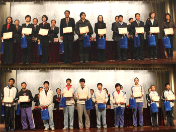出席典礼的嘉宾和领导为获奖师生颁奖获奖 师生与颁奖嘉宾合影