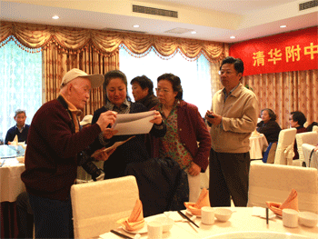 校领导与老教师一起欣赏校庆照片 全体与会者合影留念