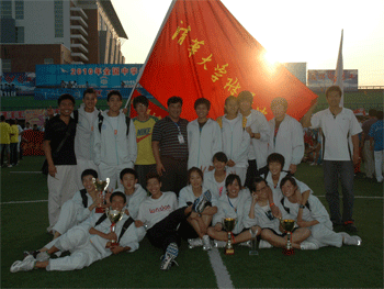 男子七项全能冠军获得者李涛(中)与教练等合影 赛后全体师生合影