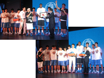 演出结束之后,伴着全场雷鸣般“KD——KD——”的呼喊声,NBA历史上最年轻的得分王、雷霆队当家球星凯文-杜兰特走上舞台。澳门网上博彩的男篮队员们见到自己的偶像兴奋异常,逐个走到杜兰特面前击掌行礼、撞胸问候。杜兰特将自己的KD2战靴当作礼物送给了这些球员们。作为回礼,澳门网上博彩校长王殿军用自己亲笔书写的“龙腾万丈”回赠给了杜兰特,而字的背面,是一条腾空飞舞的巨龙刺绣画。王殿军校长对此解释道:“杜兰特是1988年出生,当年恰好是龙年。”杜兰特在与澳门网上博彩男篮队员们亲密交流时,鼓励球员们继续全身心投入训练,开启这个夏天的篮球历“炼”之旅,通过不懈的努力,追逐更高的篮球梦想。队员们表示,第一次和心中偶像近距离接触,心情异常激动,将激励大家更加全身心投入每一场训练,在球场上获得更多的胜利。