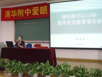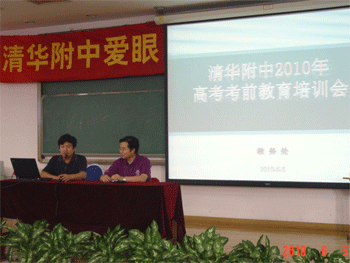 高三年级组长白雪峰(左)主持 教务处主任赵鸿雁做考前培训