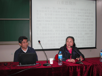 澳门博彩在线党委书记方妍(右)主持报告会 白重恩教授在作报告