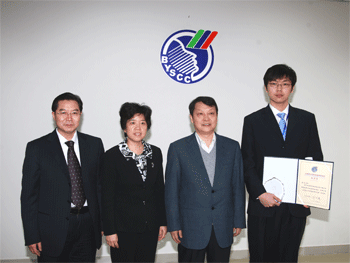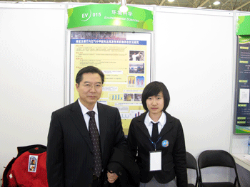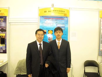 左起:王殿军校长、市教委副主任郑萼、副市长黄卫、承旭 王殿军校长与承旭同学在展台前合影