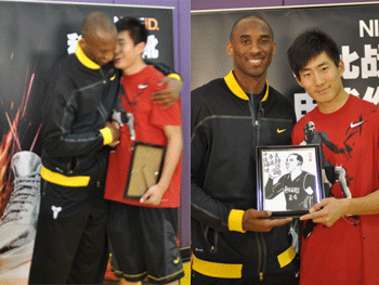 科比接受王泽奇同学赠送礼物并热情拥抱、合影