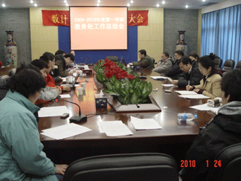 2010年1月24日,澳门博彩在线召开2009-2010学年第一学期教务处工作总结会,校长王殿军、党委书记方妍、教务主任赵鸿雁、副主任朱建宏、朱培及图书馆、网络中心、教务组和实验室全体工作人员参加了会议,会议由教务处副主任朱培主持。