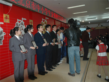 北京市教委副主任郑萼和各区、县教委领导出席大会并为获奖学生颁奖。“金、银帆奖”是北京市教委为鼓励在思想品德、学科、体育、科技、艺术方面取得突出成绩的中小学生而设立的最高荣誉奖。今年全市共评出8名金帆奖;91名银帆奖。此次表彰会旨在展示金银帆获奖学生的成果,展示各校在推进素质教育方面取得的成绩。