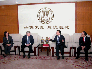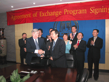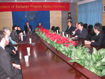 王殿军校长(右2)与美国客人会谈 双方校长在协议书上签字