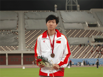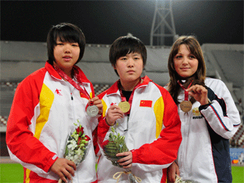 石雪薇(中)获得女子铅球冠军 李奕坤获得男子400栏季军