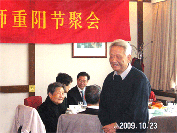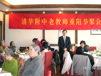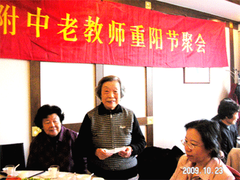 此次重阳聚会适逢新中国60华诞,大家心情愉快、喜气洋洋。几位老同志在会上即席发言:吴裕良老师在发言中感谢附中历任领导对离退休工作的重视与关怀,肯定了附中老教协多年来的工作成绩,并祝愿附中离退休工作更上一层楼。胡朝惠老师的发言表达了对附中领导敬老爱老传统的赞扬与感谢,并赋诗一首,表达了退休教师、盛世老人豪迈的心情。诗曰: