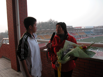 学生代表向出席颁奖会的嘉宾献花 澳门网上博彩学生电视台采访获奖教师