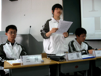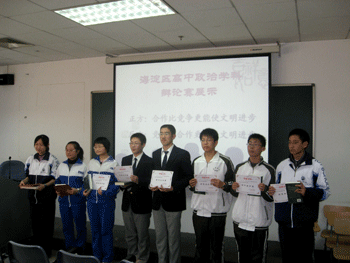 11月16日,澳门博彩在线高09级3班吴玉潇、7班薄文枚、8班陈江辉同学代表学校参加2009年度北京市政治学科辩论赛海淀分赛区的比赛,通过与101中学进行“竞争与合作谁更能推进文明”的辩论,最终薄文枚同学被评为“优秀辩手”,吴玉潇同学被评为“最佳风采”、陈江辉同学被评为“最佳口才”。
