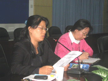 副校长杜毓贞(右)、德育处副主任陈桂芬出席会议 见习班主任(徒弟)代表发言