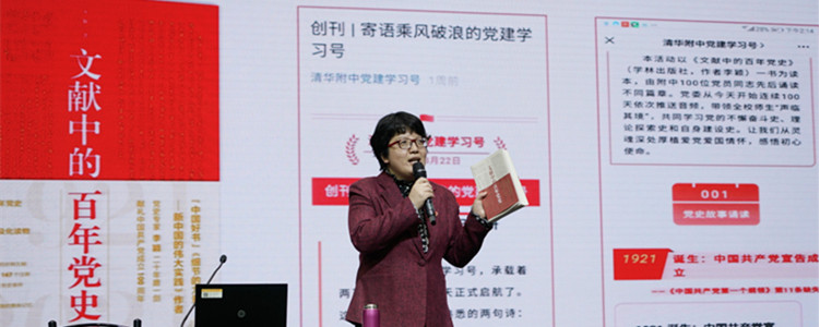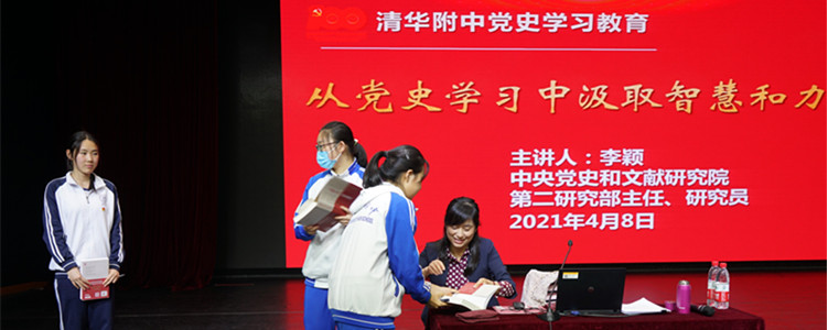 李颖长期从事党史研究,先后参加中央《中国共产党简史》等多部党史基本著作的编写,2020年11月出版专著《文献中的百年党史》。此书是一部全面生动、通俗易懂的党史读物,每年选取一件(组)珍稀文献、一个(组)重大事件,前后接续、以点带面,串联起中国共产党艰苦卓绝而辉煌光荣的百年奋斗史。今年是中国共产党成立100周年,附中党委为增强全校师生对党史的学习了解,组织100名党员志愿者诵读全书100篇故事,每日推送诵读音频,营造出浓厚的学习氛围。李颖的现身授课极大地鼓舞了附中全体师生学习掌握党史的信心与热情。报告会现场气氛热烈、掌声不断。