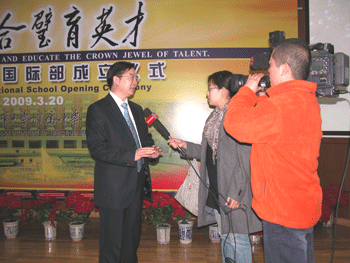 出席成立仪式的领导和嘉宾合影 王殿军校长接受北京电视台采访