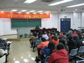 2月21日,澳门网上博彩召开2008-2009学年度第二学期班主任工作研讨会,学校有关领导,非毕业年级的年级组长、班主任,35岁以下青年教师及德育处相关老师共80余人参加会议。会议由德育处副主任陈桂芬主持。