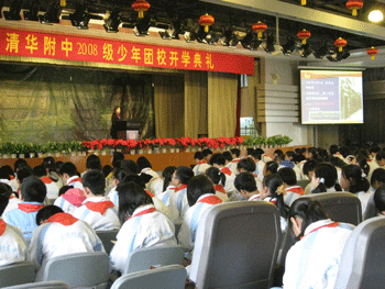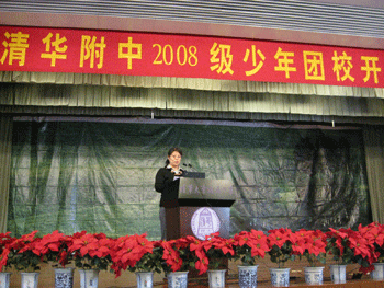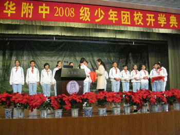 开学典礼上,陈桂芬副主任首先发言,对初08级少年团校的开办表示祝贺,同时勉励各位同学在新的学年里再接再厉,争取更大的进步。初0811班王友潮同学代表全体同学发言,表达了同学们积极进取的强烈愿望和信心。年级组长张颖老师在发言中代表全体老师给大家提出了团校学习以及新学期“从细节做起,创文明校园,做文明附中人”的具体要求。团委书记高昕老师宣布了初08级各中队与高08级各对口支部名单,并向各中队颁发了团章。