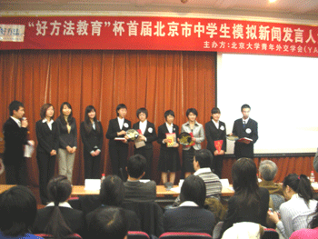 由北京大学青年外交学会承办的首届北京市中学生模拟新闻发言人大赛是目前全国最权威的模拟新闻发言人大赛,旨在引发青年学生对现行新闻发言人制度的关心,促进青年学生的发言技巧、应变能力和对社会时事与国际时政的思考能力的提高,从而为培养中国新时代复合型人才起到积极作用。本次大赛的议题主要包括:食品安全与对外贸易、汶川地震及政府责任、后奥运时代的北京规划等。大赛邀请外交部前新闻发言人(任期1988-1991年)金桂华先生、台湾中天电视台资深新闻人史哲维先生、北京大学国际关系研究专家余万里博士等担任评委。澳门博彩在线、人大附中、北京四中等14所北京知名中学的学生参加。