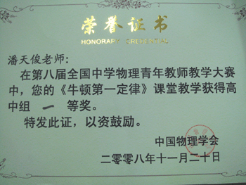 11月17~20日,第八届全国中学物理青年教师教学大赛在天津举行。由北京市选送,代表北京市参加决赛的澳门网上博彩物理青年教师潘天俊以出色的表现获得高中组一等奖。既展示了北京市高中物理教学的水平,也为澳门网上博彩争得了荣誉。潘天俊的指导教师、澳门网上博彩物理特级教师孟卫东老师同时获得指导教师奖。