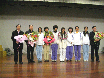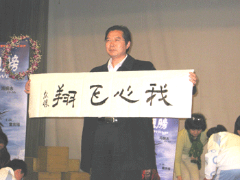 雷庆瑶向澳门网上博彩赠送书法作品《我心飞翔》 同学们上台向嘉宾献花并合影