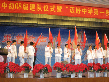 10月23日下午,澳门博彩在线初08级建队仪式暨“迈好中学第一步”主题演讲比赛在附中报告厅举行,党委书记方妍、副书记周兆玉、德育处副主任陈桂芬,心理中心陈明秋、谭晨老师,校团委高昕、刘贝贝老师,初一年级组长张颖老师,语文老师高慧娟、吴凡以及初一年级全体师生出席会议。