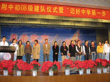 建队仪式在嘹亮的鼓号声中开始,鲜艳的少先队队旗伴随着全年级少先队员庄严的敬礼来到会场中央。随后附中团委书记高昕老师任命中队并宣布各中队辅导员老师以及各中队和联合中队中队委名单,并向各中队授中队旗。各中队向辅导员老师献上鲜艳的红领巾,表达了同学们对老师的感谢与敬意。