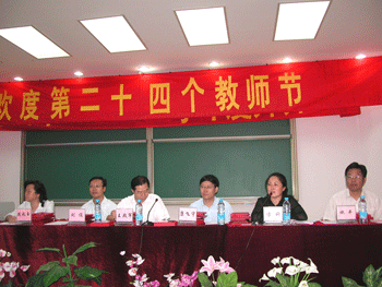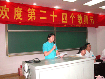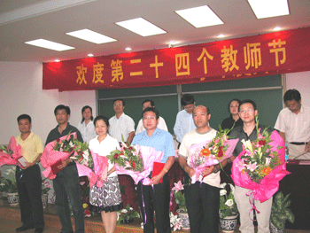 附中党委副书记周兆玉宣读了2007至2008学年度教师个人和集体表彰名单,获得各级荣誉和奖励的教师代表上台接受与会领导颁发证书和少先队员献花。政治特级教师杜毓贞代表全体教师发言,表示要用一颗大爱的心、一股奉献的精神、一种进取的意识,担当起教师这一神圣使命,不求轰轰烈烈,但求踏踏实实,不求涓滴相报,但求人生无悔。