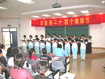 大会最后,初中的少先队员为老师们表演了精彩的诗朗诵,赢得老师们热烈的掌声。