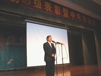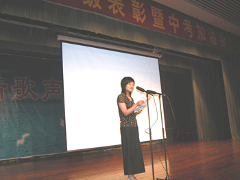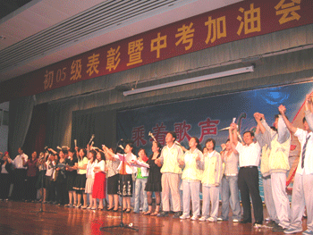 为了在会上给同学们加油助威,五个教研组的老师们齐上阵,在繁忙的工作之余抽出时间高效排练出了精彩的节目。英语组是优美的合唱,用奥运精神鼓舞大家精神;语文组是情境朗诵,用《新出师表》来振作同学士气;数学组是朗诵和合唱,用《我愿作你的平行线》来感染学生情怀;物理组是小品,让天堂物理学家来为考生助威;化学组是诗朗诵,用《昨天·今天·明天》来勉励莘莘学子。老师们的节目真挚感人,生动活泼,充分看出了三年来他们对学生所做的巨大奉献,所投入的深厚情感。在老师的节目之间还穿插了学生们精彩的演出,有器乐演奏,有声乐合唱,有诗歌朗诵,学生们表达了对学校的眷恋感激,对未来的向往和追求。最后,老师和同学全体演唱《朋友》,将整个活动推向高潮,学生老师融为一体,台上和台下彼此应和。整个会场洋溢着歌声与微笑,和谐与幸福。