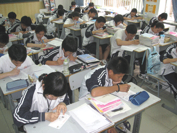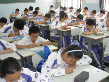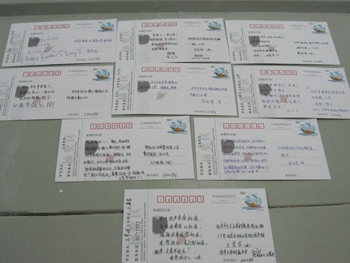 高一学生在认真书写明信片 初一学生在认真书写明信片