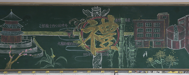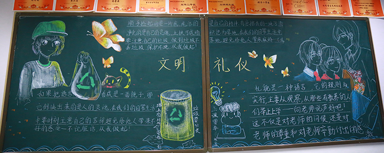 同学们利用粉笔诠释对语言文明、礼仪修养、卫生习惯等方面的认识。同学们在制作黑板报的过程中,也勉励自己,做到“博文约礼真君子,厚德自强附中人”。