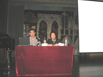 初二年级组长崔建体(右)主持报告会 林辉先生在做报告