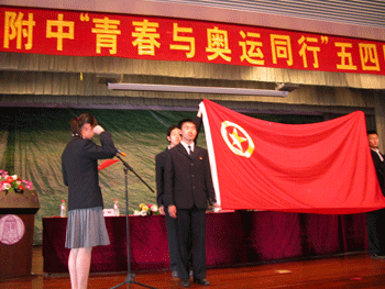 全体新团员面对团旗庄严宣誓 领导们为获奖班级和个人颁奖
