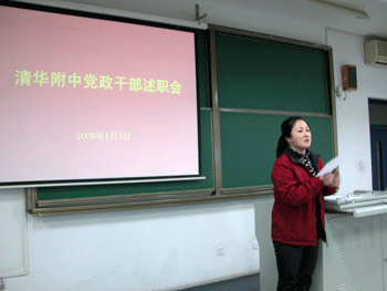 2008年1月3日下午,澳门网上博彩召开校级党政干部述职会。大学工会常务副主席向波涛出席并主持对党政领导班子成员的民主评议程序。附中党委委员、在职各党支部书记、中心主任以上干部、大学教代会代表、教研组长、年级组长等50余人到会听取述职和参加评议。附中党委书记方妍主持会议。