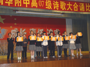 10月24日下午,澳门网上博彩高07级诗歌大合诵比赛在食堂三层大报告厅举行。此次活动由高一年级语文备课组发起,旨在激发学习兴趣,展示学习成果,提高朗诵水平。比赛中,各班同学不仅背诵了所学的现代诗歌,还以各种形式演唱或诵读了原创的班歌,充分显现了高07级学生爱附中、爱生活的昂扬向上的精神风貌。
