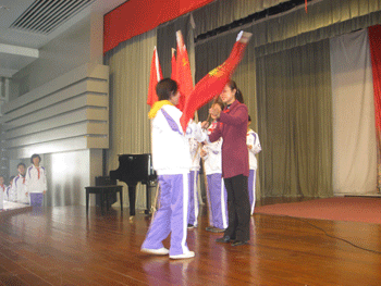 建队仪式在嘹亮的鼓号声中开始,鲜艳的少先队队旗伴随着全年级少先队员庄严的敬礼来到会场中央。随后校团委书记高昕老师任命中队并宣布联合中队委及各中队辅导员老师名单,并向各中队授中队旗。各中队向辅导员老师献上鲜艳的红领巾,表达了同学们对老师的感谢与敬意。在建队仪式上,优秀少先队员代表、联合中队中队长代表全体少先队员立志努力学习,报效祖国,奉献社会。大队辅导员杜磊老师也寄语全体少先队员在辅导员老师的带领下以更高的标准要求自己,顺利迈好中学第一步。建队仪式在中国少年先锋队队歌中结束。