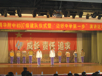 10月25日下午,澳门网上博彩初一年级建队仪式暨“迈好中学第一步”主题演讲比赛在附中报告厅举行,心理中心谭晨老师,校团委高昕老师、杜磊老师,德育处张国梅老师,初一年级组长郎艳老师、以及初一年级全体班主任老师出席会议。