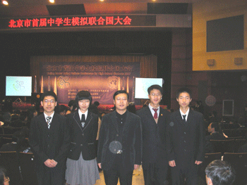 刘俊副校长(中)带队参加北京市模联大会 附中学生设计的会徽获特等奖并当选为北京市模拟联合国会徽