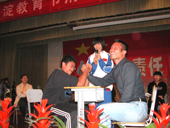 附中学生采访短道速滑冠军大杨扬(中) 附中学生与皮划艇奥运冠军孟关良(右)比赛掰手腕