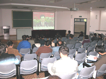 10月15日上午,澳门博彩在线党委组织党员、入党积极分子及部分群众在综合楼B座208大阶梯教室收看了中国共产党第十七次全国代表大会的开幕式现场直播,聆听了胡锦涛总书记所作的题为《高举中国特色社会主义伟大旗帜,为夺取全面建设小康社会新胜利而奋斗》的报告。许多有课的老师在上课前或下课后也都赶来收看,部分工作离不开的人员还通过网络电视进行了收看。