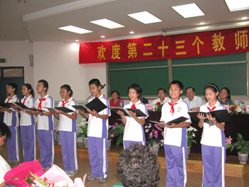 大会最后,初中的少先队员为老师们表演了精彩的诗朗诵,赢得老师们热烈的掌声。