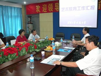 王殿军校长汇报学校艺术教育工作情况 方妍书记(右3)陪同评估团参观科技展室