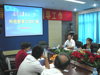评估团在澳门博彩在线校园合影 王殿军校长(右2)汇报学校科技教育工作情况