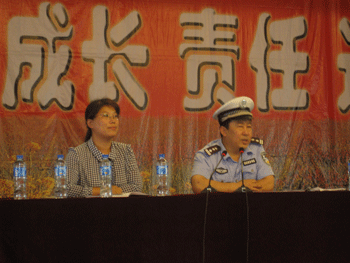 陈枢警官(右)给同学们做交通安全报告 交通安全报告会会场