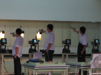 女子气步枪个人冠军李佩璟在比赛中 男子气手枪个人亚军赵晟华(中)在比赛中