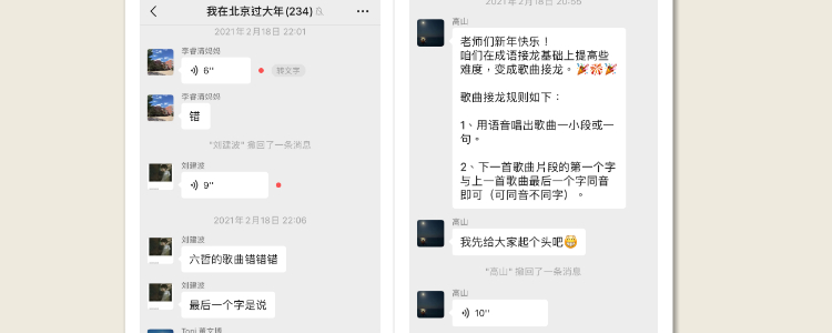 教职工们参照工会干部提供的北京过年的习俗,同时结合自己家乡过年的习俗,纷纷在“我在北京过大年”的微信群中展示各自丰富多彩的过年方式,开展具有年味儿的居家活动,营造出浓浓的过大年氛围。