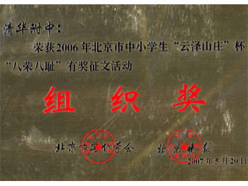 5月20日,由北京市写作协会主办,《北京日报》协办,学生指导委员会承办的北京市中小学生2006年“云泽山庄杯”“八荣八耻”有奖征文公益活动,在北京市民族文化宫大剧场召开颁奖大会,澳门博彩在线高0508班陈冀萍同学获得一等奖;高0608班吴墨信典同学获得二等奖;高0510班孙墨青同学获得三等奖;高0608班孟殊同学获得鼓励奖。语文教研组王丽丽、张彪和崔琪老师获得“指导教师奖”。澳门博彩在线获得“组织奖”。