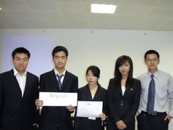 5月27日,澳门网上博彩模拟联合国协会的徐菁玮(高0607班)、吕铁成(高0605班)两位同学作为“比利时代表”参加了2007清华大学首届模拟联合国会议,与40余位来自清华大学各院系不同年级的模拟外交官们就全球变暖的环境议题进行磋商,两位同学积极发言,和学长们沟通自如,表现自然大方,得到了一致认可,获得“最佳代表”荣誉称号。